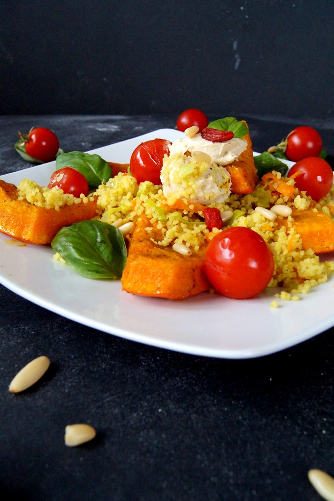 würzige Kürbisspalten mit einem spicy Gewürz-Couscous und Zitronenhummus(vegan)