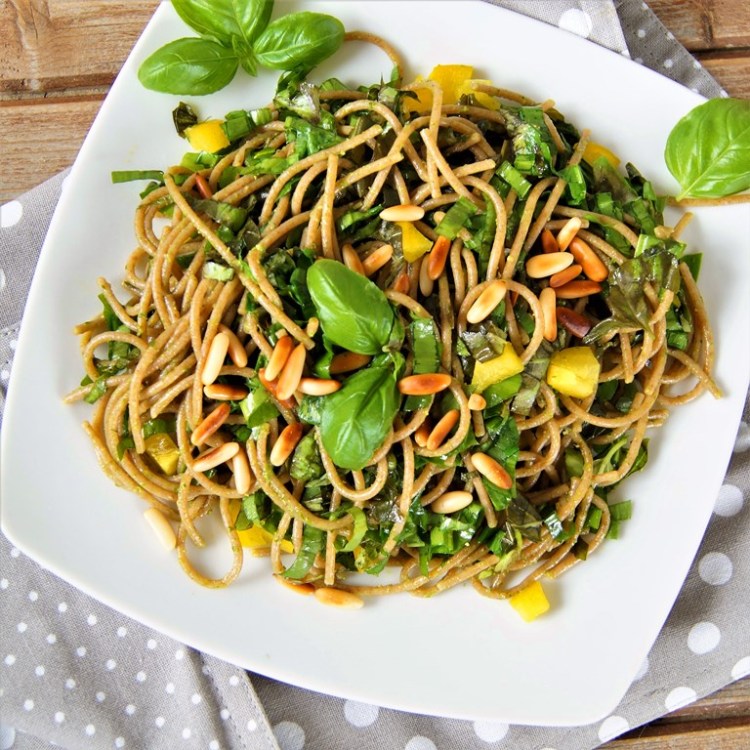 Mein Basilikum-Bärlauch-Pesto eignet sich hervorragend, um eine Pasta mit Gemüse aufzupeppen und ihr einen unvergleichlichen Geschmack zu verleihen.