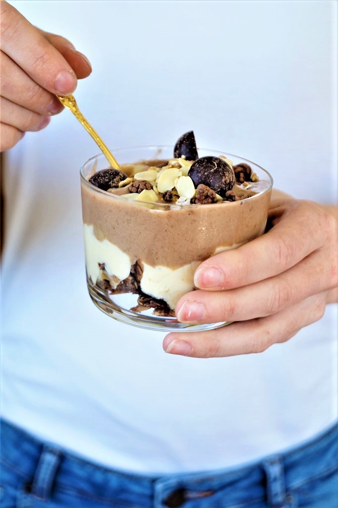 Ein knuspriges Granola, veredelt mit einem Haselnussnougat und Schoko-Flocs, gefolgt von einer cremigen Mangoschicht und einem samtigen Schokoladen-Nicecream. Frisch, fruchtig und ein richtiger Energiekick. Perfekt als süßes Frühstück, gesunder Nachtisch oder einfach als erfrischender Snack für zwischendurch.