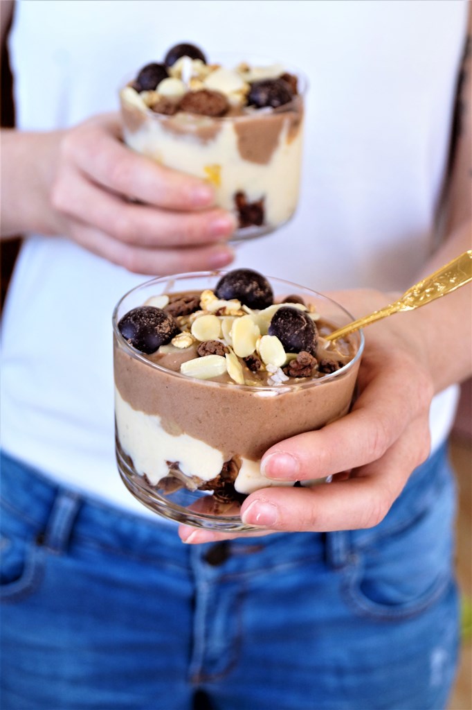 - Nun beginnt die Schichtarbeit. Zuerst Granola, danach die Mangocreme und on top das Schokoladen-Nicecream.