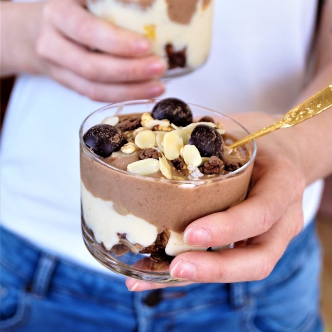 Ein knuspriges Granola, veredelt mit einem Haselnussnougat und Schoko-Flocs, gefolgt von einer cremigen Mangoschicht und einem samtigen Schokoladen-Nicecream. Frisch, fruchtig und ein richtiger Energiekick. Perfekt als süßes Frühstück, gesunder Nachtisch oder einfach als erfrischender Snack für zwischendurch.