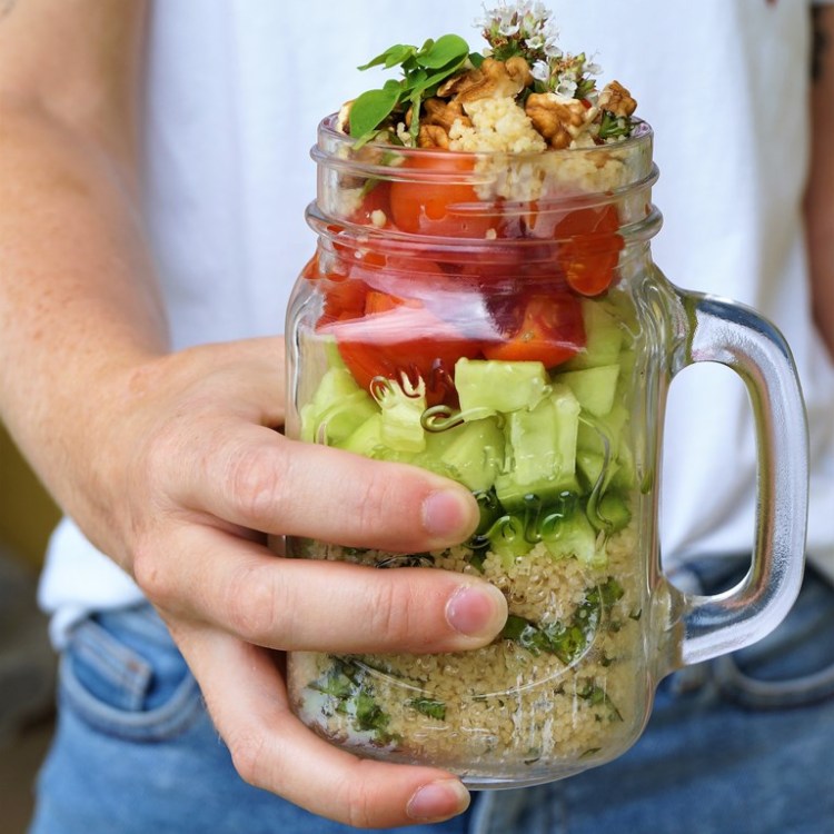 Bei mir gibt’s des Öfteren solche Tage, vor allem jetzt im Sommer, wo es manchmal so heiß ist, dass ich Panik bekommen, wenn ich nur daran denke, stundenlang vorm Herd zu stehen… Im Sommer mag ich es generell lieber einfacher, liebe fruchtig leichte Speisen und kühle Snacks. Deshalb ist dieser Couscous Salat im Glas genau der richtige Snack für mich, denn man kann ihn super einfach transportieren und mit zur Arbeit nehmen oder auch am See genießen…