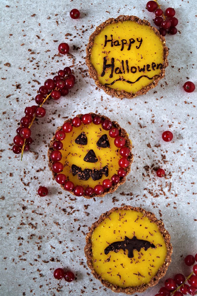 Diese süßen Mini-Tartelettes sind ein perfekter Begleiter für Halloweenpartys und machen auch optisch was her. Gefüllt sind diese Leckereien mit einer fruchtigen Mangocreme, die durch Chili und Ingwer das gewisse Etwas bekommt. Für den Boden habe ich den Haselnussnougat von Zotter verwendet, da der Geschmack von Haselnüssen einfach unglaublich gut mit der fruchtigen Mango harmoniert.