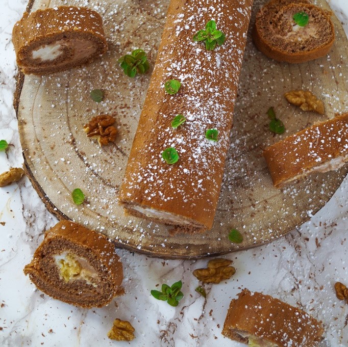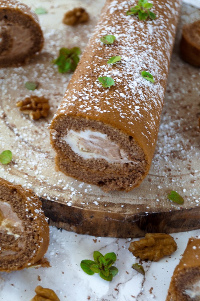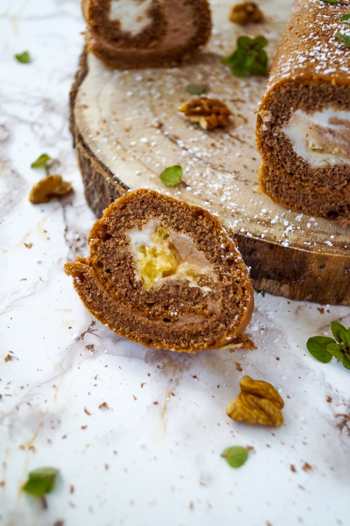 fluffige Biskuitroulade mit einer erfrischenden Weiße-Schokoladencreme, einer herben dunklen Schokoladencreme und Mandarinen