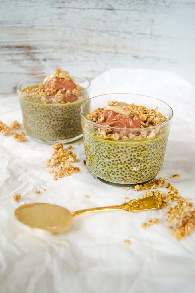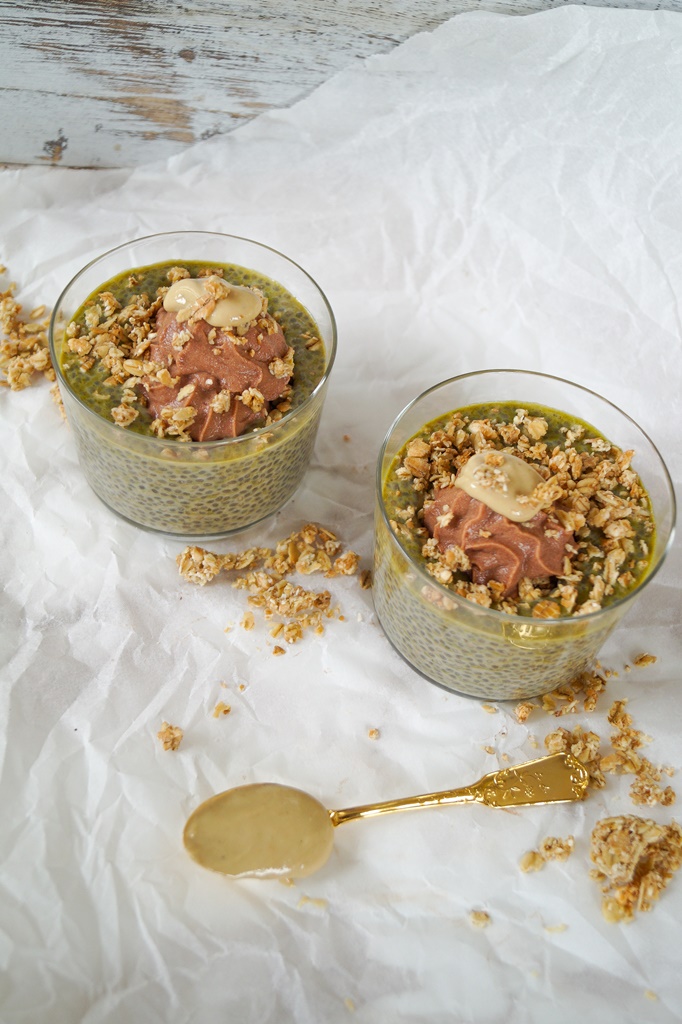 Gebt nun einen Klecks der Walnuss-Nougat-Sahne auf den Grüntee-Chia-Pudding, streut Granola darüber und gebt on Top noch einen TL Cashewmus hinzu.