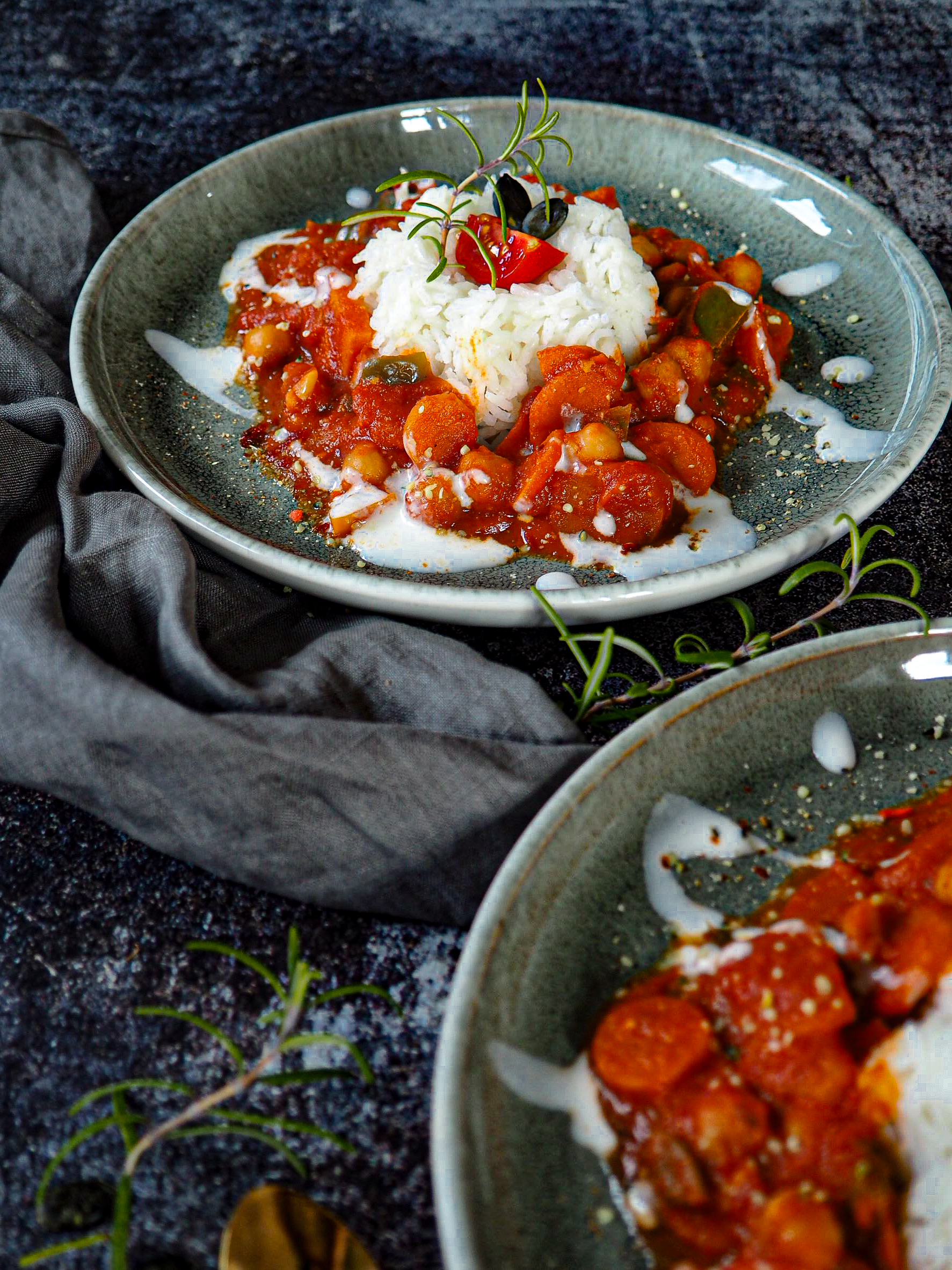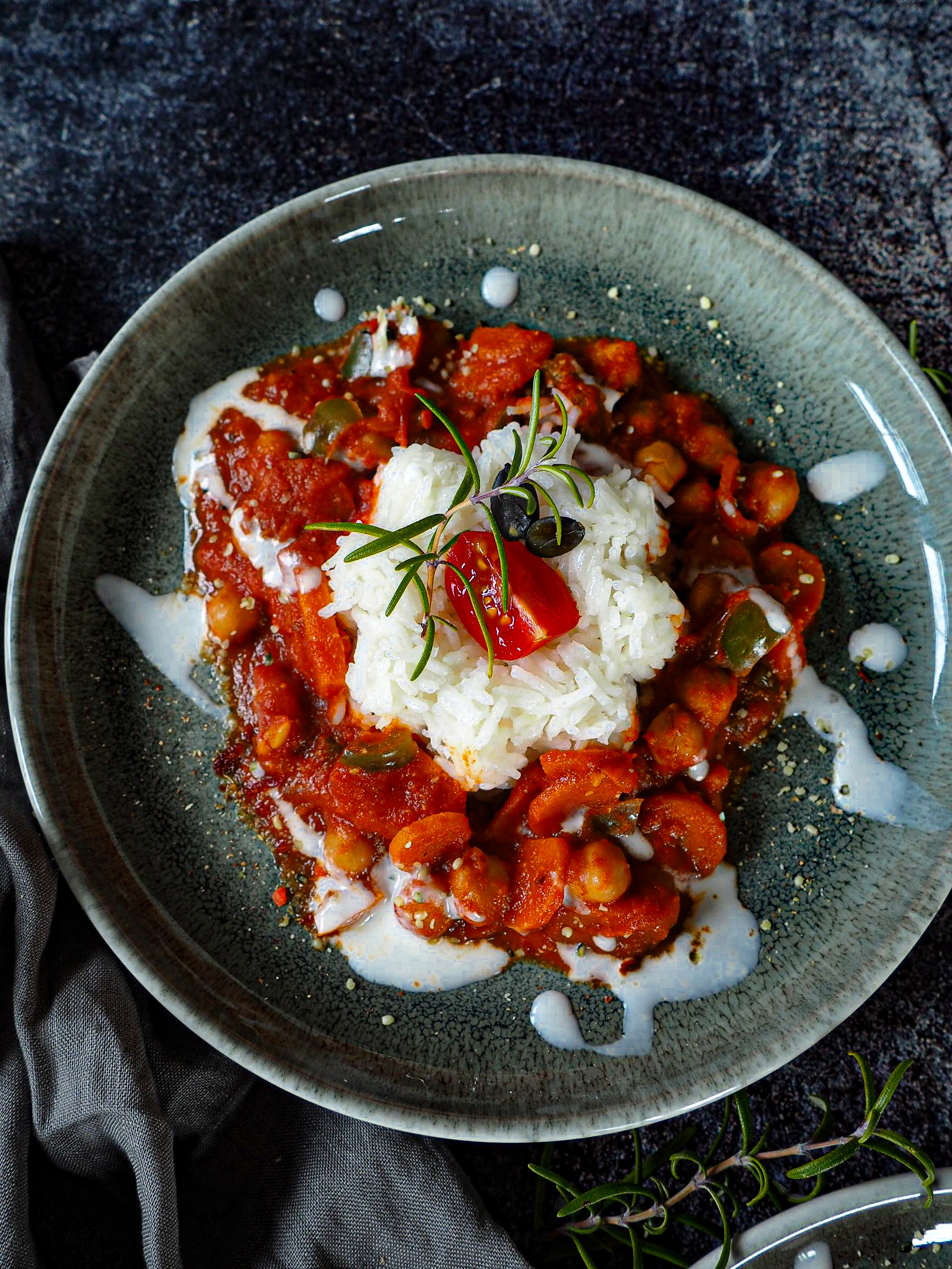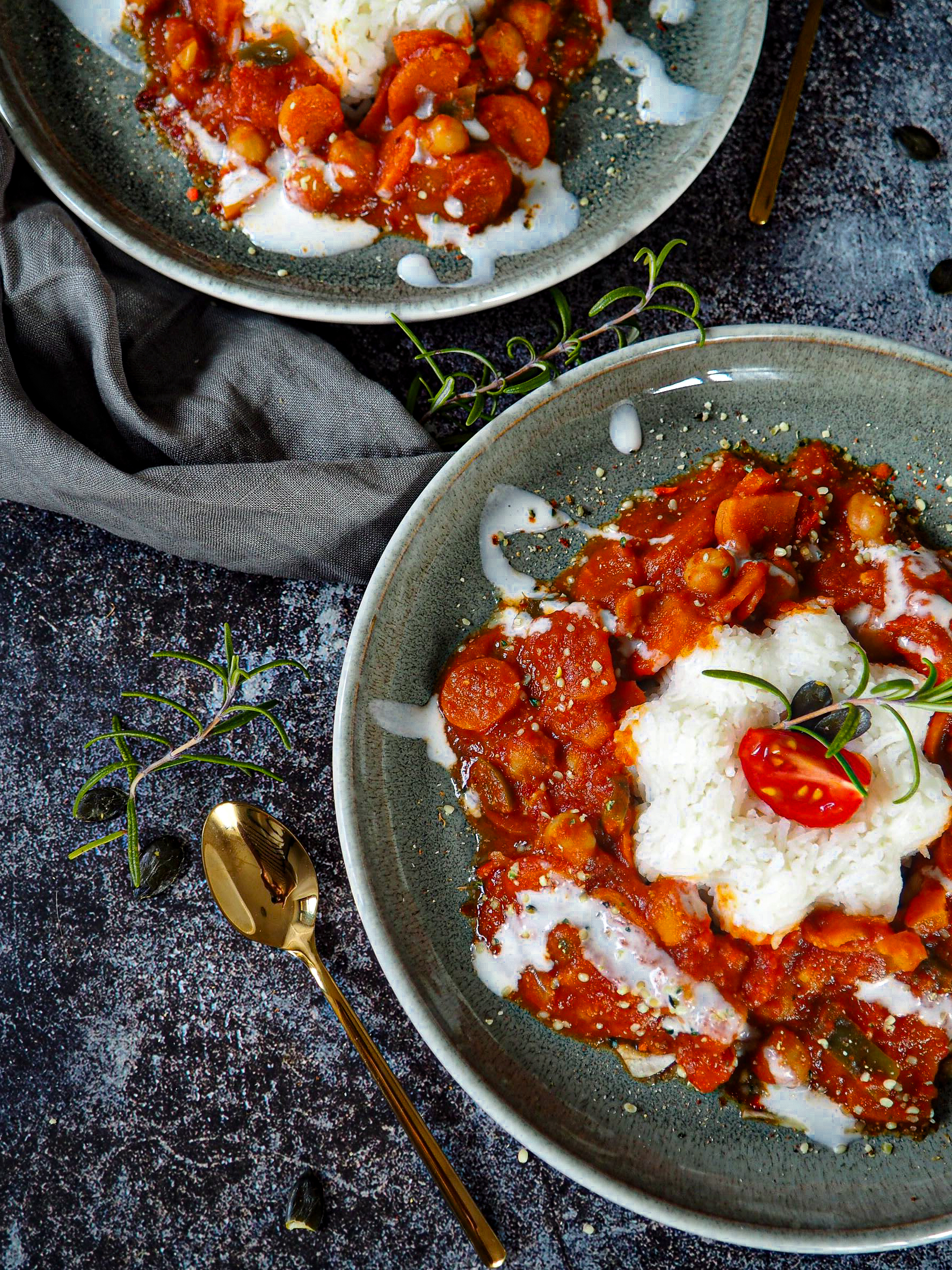 Ich habe das Ragout hier mit knackigem Basmatireis serviert. Ihr könnt aber auch andere Alternativen verwenden. Das vegane Kichererbsen Linsen Ragout schmeckt auch super lecker, wenn es mit Quinoa oder Couscous serviert wird. Auch zu Polenta, Buchweizen oder Nudeln passt es hervorragend. Wenn ihr Lust habt, könnt ihr auch ein cremiges Kartoffelpüree dazu kochen oder für eine glutenfreie Pasta-Variante Linsennudeln, Erbsennudeln etc.