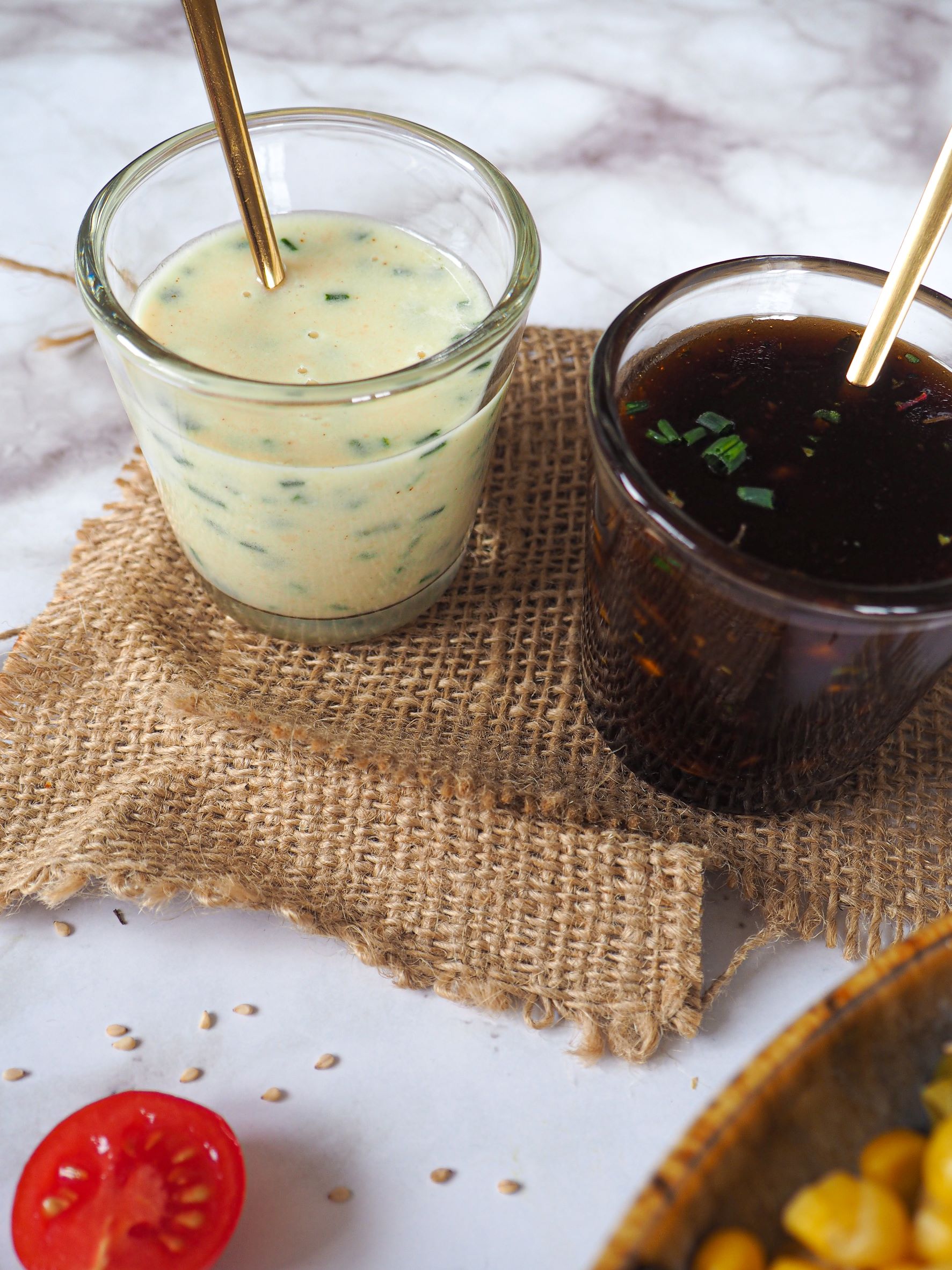 Knackiger Blattsalat, frisches Gemüse, selbst gemachte Falafel Bällchen und dazu drei super einfache, aber mega leckere Salatdressings – diese vegane Buddha Bowl ist nicht nur reich an wichtigen Nährstoffen, sondern schmeckt auch unvergesslich gut. Meine vegane Buddha Bowl ist in nur wenigen Minuten fertig, die Zutaten können nach Wahl ausgetauscht werden und sie ist reich an Vitaminen und gesunden Fetten. Die drei verschiedenen Salatdressings sind ein süßes Balsamico-Senf-Dressing, ein veganes French Dressing mit Schnittlauch und ein Bärlauchpesto.