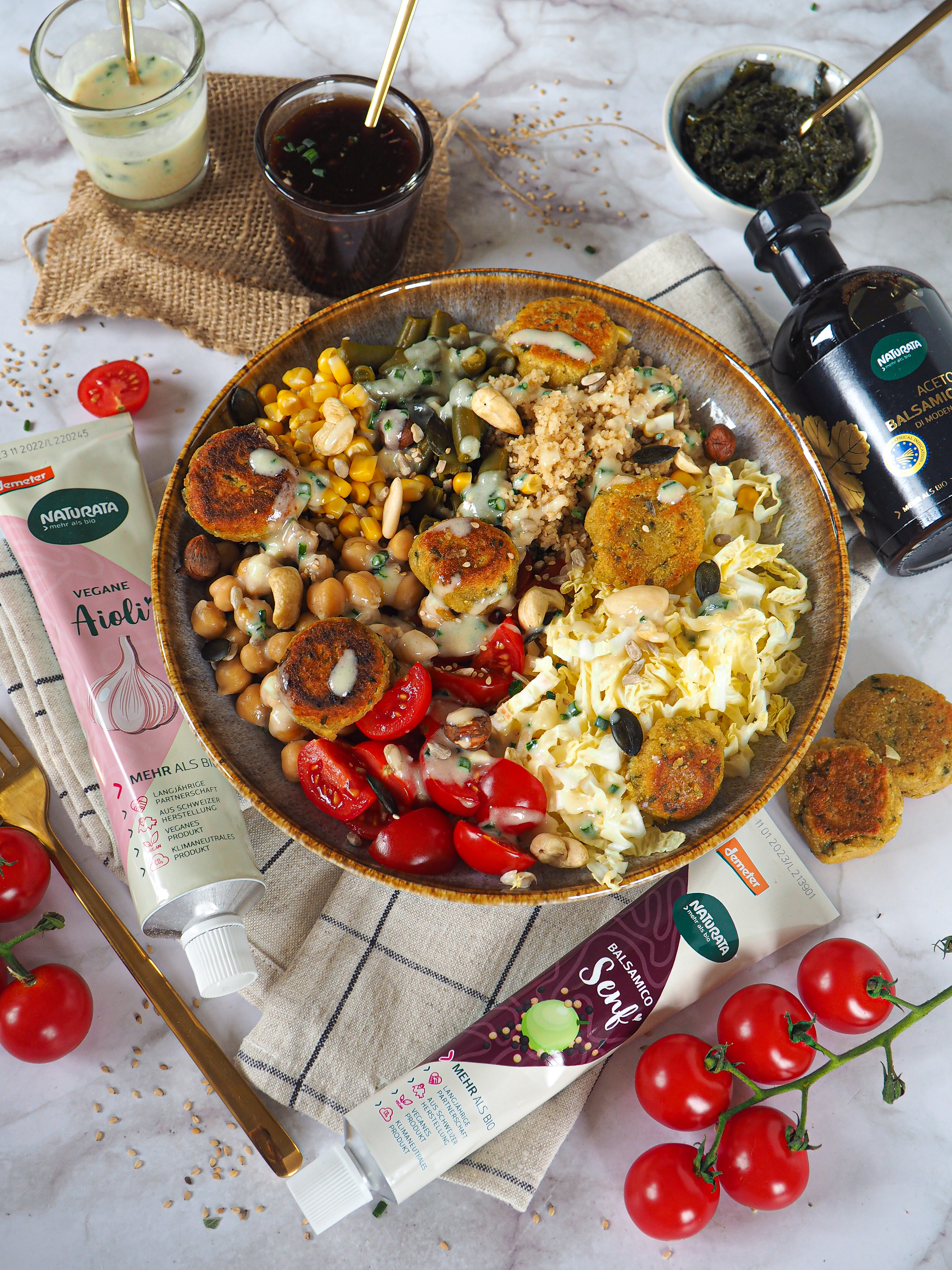So ihr Lieben, jetzt spanne ich euch aber nicht länger auf die Folter und verrate euch meine Rezept für meine vegane Buddha Bowl mit selbst gemachten Falafel-Bällchen, einem veganen French Dressing, einem Balsamico Dressing und Bärlauch Pesto.