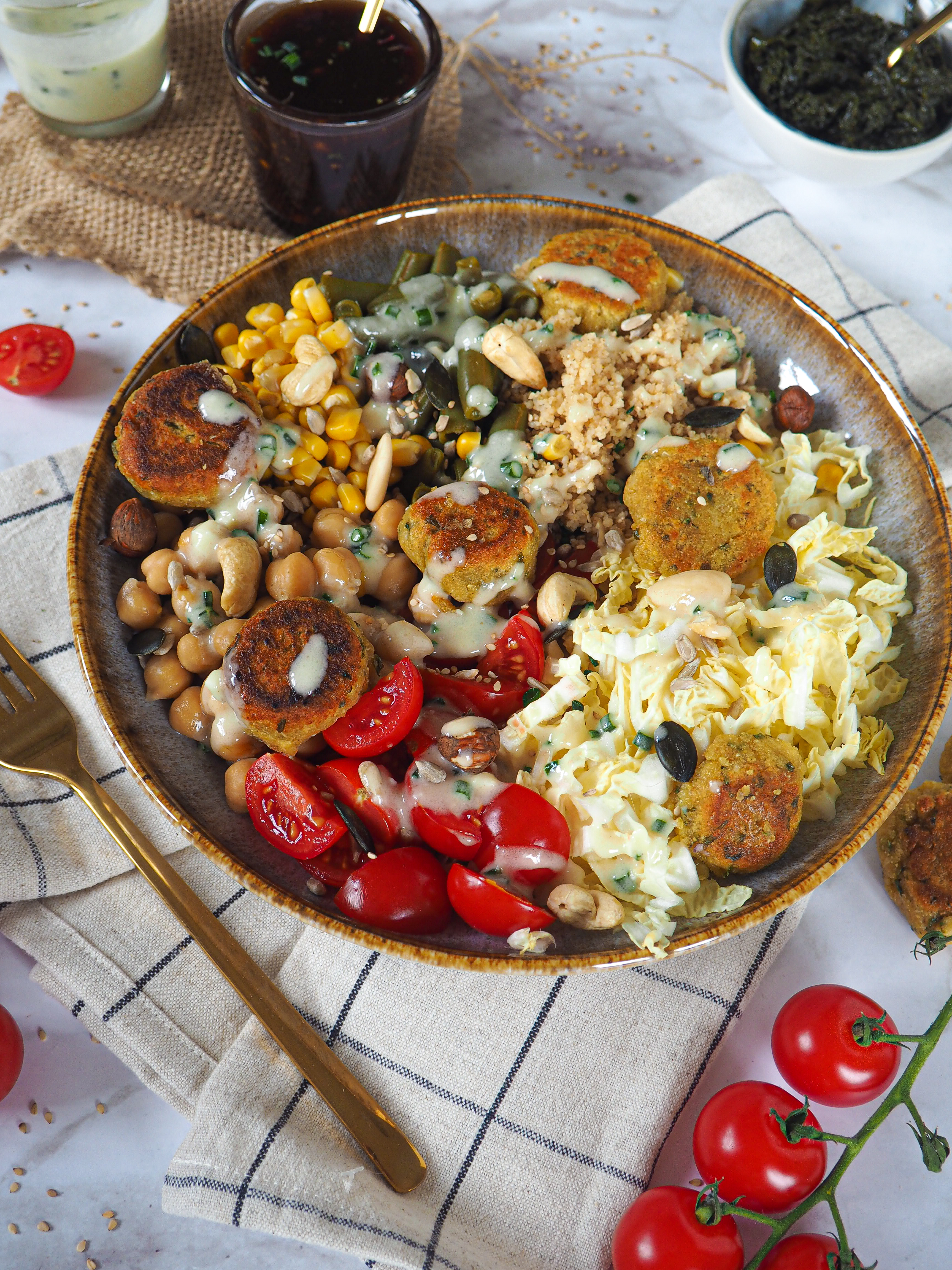 Ich habe meine vegane Buddha Bowl zudem mit selbst gemachten Falafel-Bällchen getoppt. Wenn ihr Falafel Bällchen nicht mögt, dann könnt ihr natürlich auch eine Alternative verwenden. Gemüsebällchen, geräucherter Tofu, gebratener Tofu, Seitan… – die Möglichkeiten sind unendlich 🙂