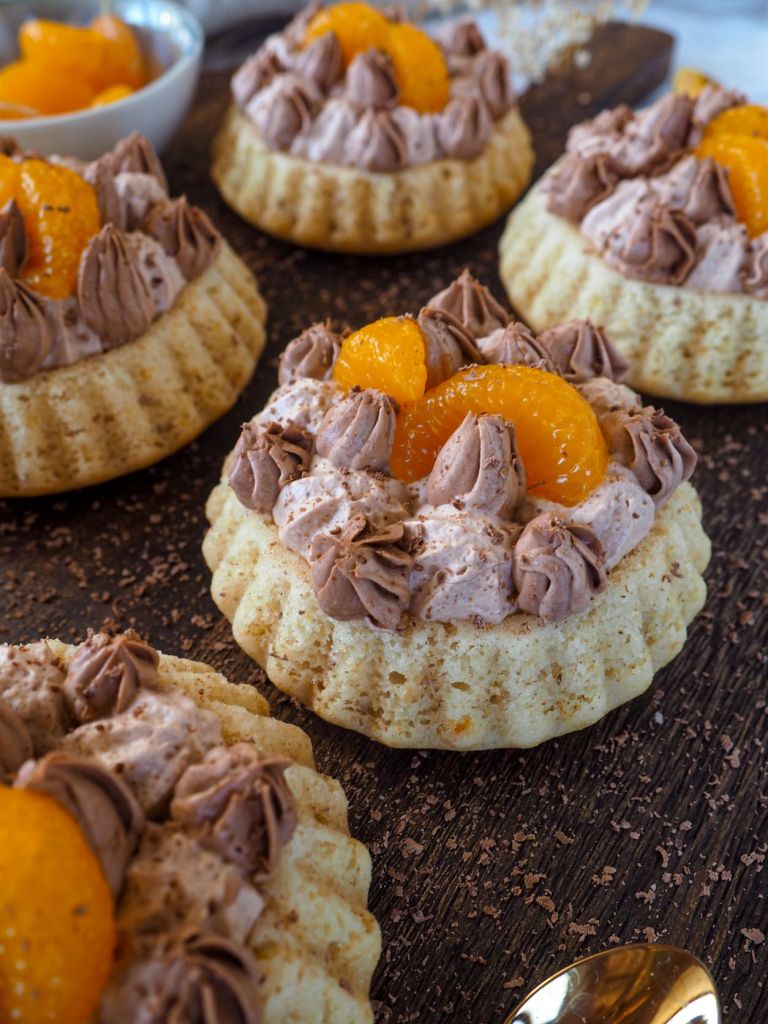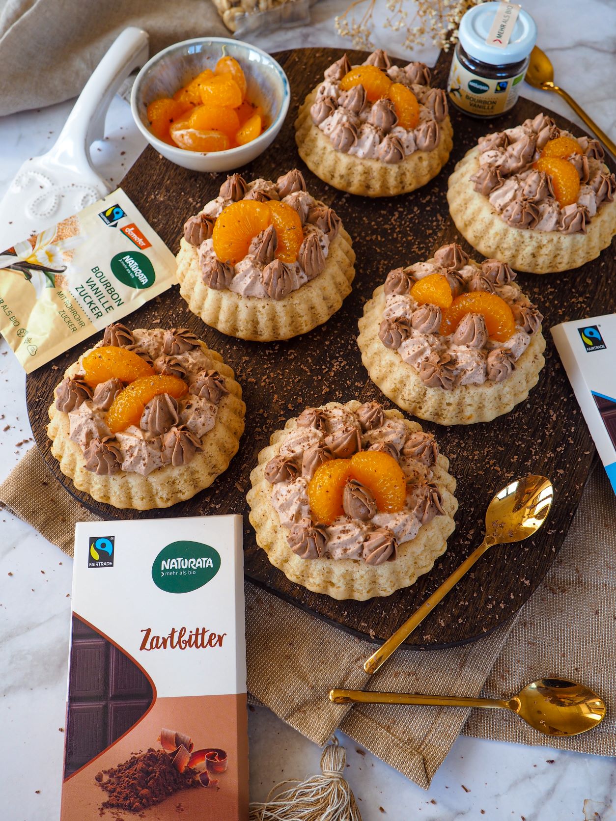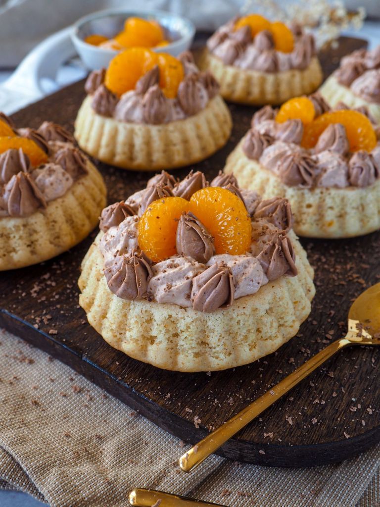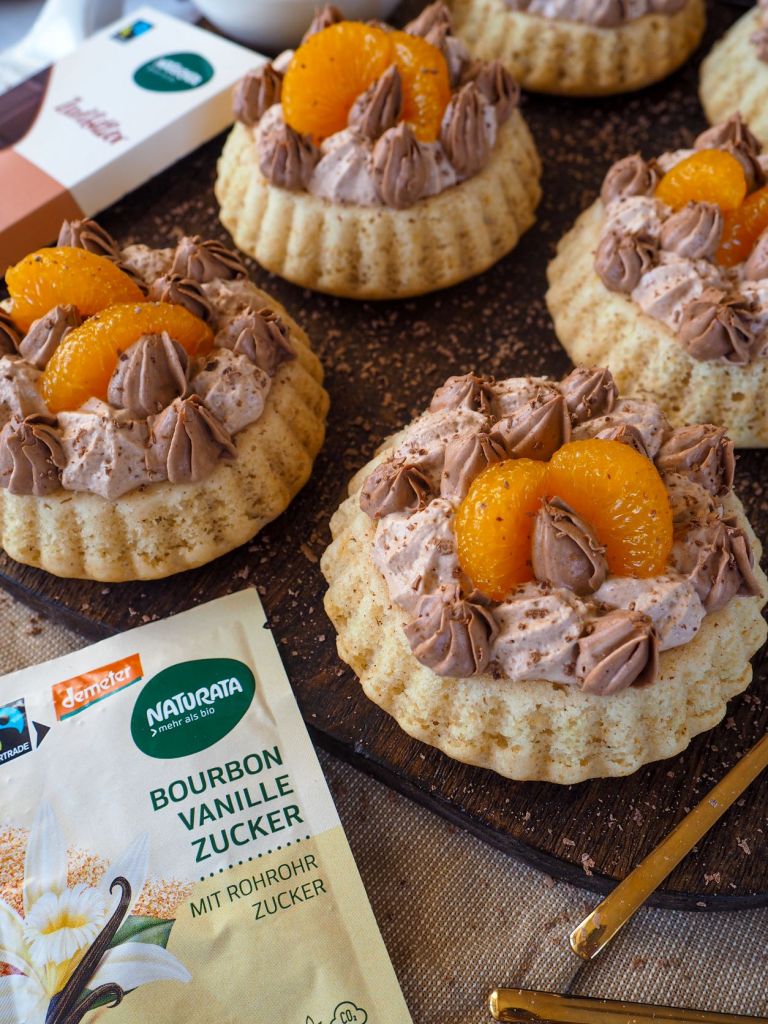 Ihr könnt eure Tartelettes natürlich nach Lust und Laune toppen. Ich habe saftige Mandarinen verwendet, da sie sehr gut mit Schokolade und Zimt harmonieren. Ihr könnt aber natürlich auch verschiedene Beerensorten wählen. Diese schmecken auch sehr lecker zu Schokoladencremen. Anstatt der Mandarinenschale im Teig könnt ihr auch Zitronen- oder Orangenschale verwenden, und anstatt Zimt könnt ihr natürlich auch Lebkuchenpulver verwenden. Wer möchte, kann dem Rührteig auch noch geriebene Mandeln oder Haselnüsse oder Kokosflocken beimengen. Schmeckt auch richtig gut.