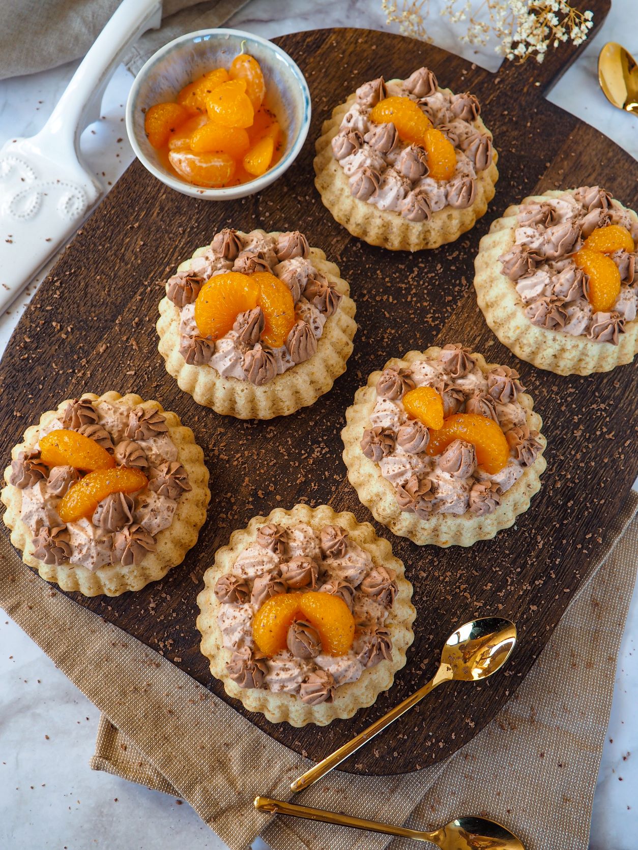 - Tartelettes mit den Schokoladencremen versehen und mit gehäuteten Mandarinen und Schokoladenraspeln toppen.
