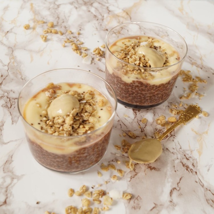 Für den Schokoladen-Chiapudding:500 ml Haferdrink (oder ein anderer pflanzlicher Drink)50 g vegane Nougatschokolade1 TL Kakao60 g Chiasamen optional Agavensirup Für die Mango-Bananencreme:1 Banane1 Handvoll gefrorene Mangostücke1 EL Cashewmus1 EL AgavensirupHaferdrink Für den Schokoladen-Chiapudding schmelzt ihr die Schokolade im Haferdrink (am besten über einem Wasserbad), rührt den Kakao ein und lasst alles etwas abkühlen. Optional könnt […]